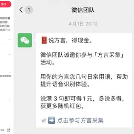 中国社交平台微信近期推出“方言采集”返现活动,邀请用户录制各地方言语音(即声纹)以换取现金奖励。活动上线后,有参与者称累计获得数百元收益。随着参与范围扩大,讨论延伸至个人隐私问题,方言曾被中国网民视为相对隐蔽的交流方式。