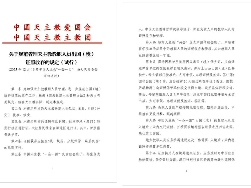 中国多地宗教教职人员近期反映,其出境活动受到更严格限制。天主教系统已通过内部文件,对教职人员出国证照实行统一收存和审批管理,相关做法正在地方层面执行。